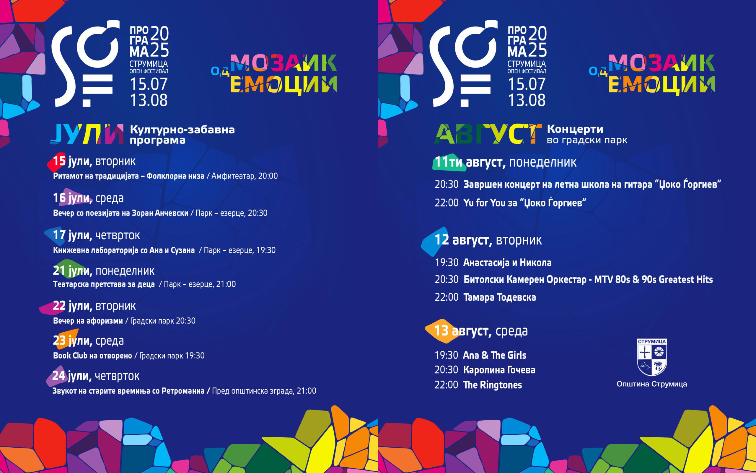 Во 17 дена, на преку 20 настани, публиката ќе има можност уште еднаш да се забавува, дружи, спортува и ужива во богатата културно-забавна и спортско-рекреативна програма која ви ја нуди еден од најголемите фестивали во земјава.